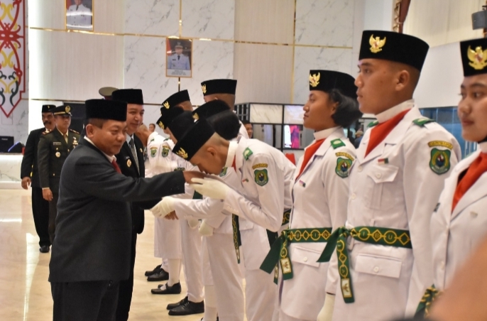 Upacara pengukuhan ditandai dengan prosesi penciuman bendera merah putih oleh Paskibraka dan penyematan kendit oleh Bupati Kapuas.