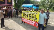 Dalam spanduk yang dibawa oleh dua lelaki itu, terdapat tulisan “Gedung Ini Disita Oleh Rakyat Disegel Karena Sudah Tidak Memiliki Fungsi”