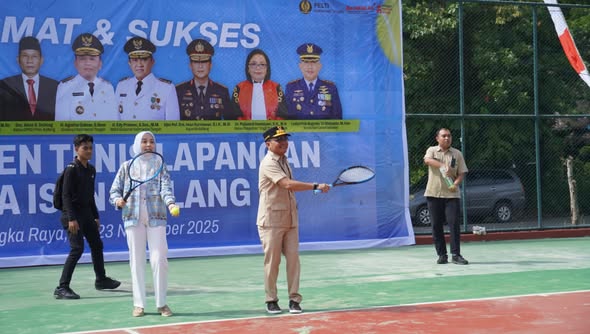 PALANGKA RAYA-Gubernur Agustiar Sabran secara resmi membuka Turnamen Tenis Lapangan Piala Isen Mulang Se-Kalimantan Tengah (Kalteng) Tahun 2025 di Lapangan Tenis Sanaman Mentikei, Jalan R.A. Kartini Palangka Raya, Jumat (21/11/2025) pagi. Acara pembukaan ditandai dengan pemukulan bola pertama oleh Gubernur dan Ketua TP PKK Provinsi Kalteng Aisyah Thisia Agustiar Sabran.
