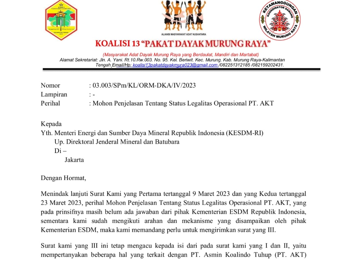 Ketua Aliansi Masyarakat Adat Nusantara (AMAN) Kabupaten Murung Raya, Syahrudin, mengungkapkan masyarakat adat telah mengetahui aktivitas ilegal PT AKT sejak lama. Upaya penutupan operasional perusahaan sudah dilakukan sejak 2023.