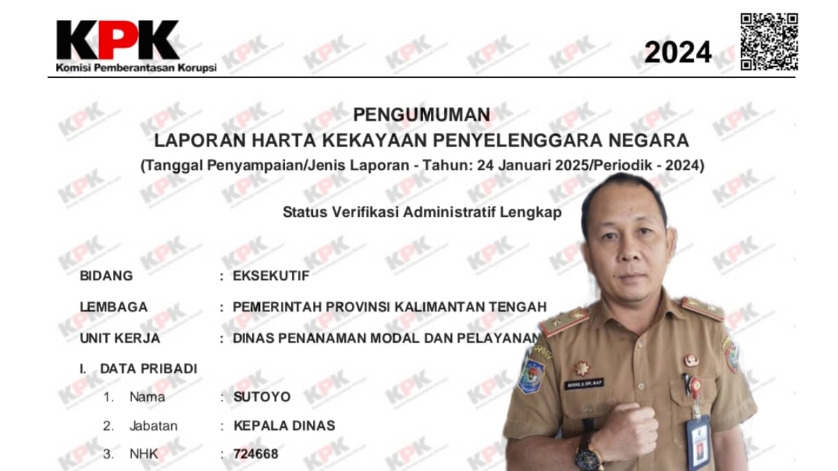 CYRUSTIMES, PALANGKA RAYA – Kepala Dinas Penanaman Modal dan Pelayanan Terpadu Satu Pintu (DPMPTSP) Kalimantan Tengah (Kalteng) Sutoyo yang baru ditunjuk sebagai Pelaksana Tugas (Plt) Kepala Dinas (Kadis) Energi dan Sumber Daya Mineral (ESDM) tercatat memiliki harta kekayaan sebesar Rp9,27 miliar. Angka tersebut tertera dalam Laporan Harta Kekayaan Penyelenggara Negara (LHKPN) periode 2024 yang disampaikan ke Komisi Pemberantasan Korupsi (KPK) pada 24 Januari 2025.